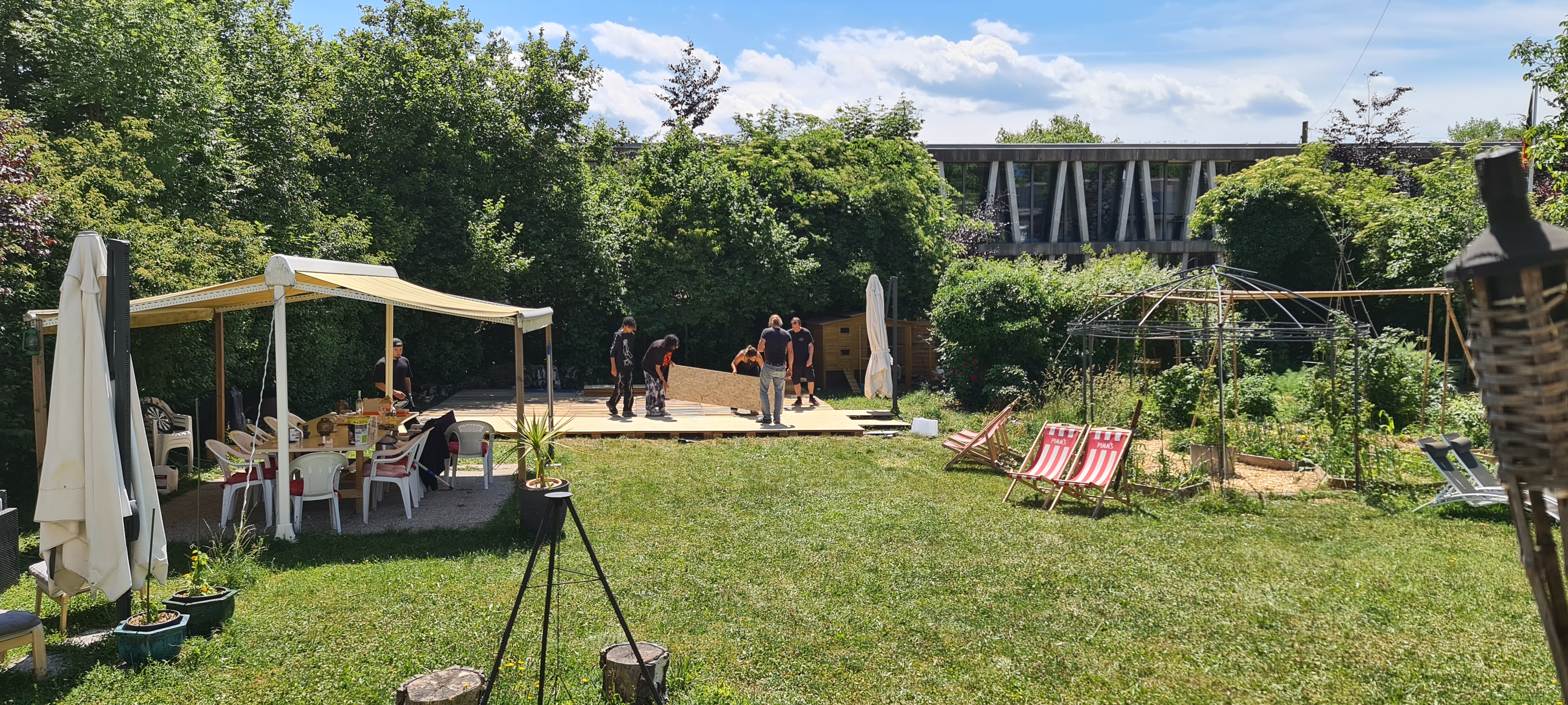 Construction avec l'équipe ECOJeunes du plancher qui accueillera le nouveau dôme géodésique dans le jardin d'ideavox.